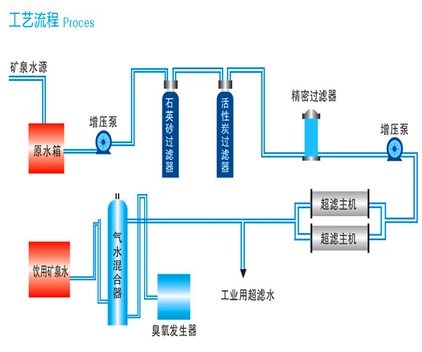 原水箱→原水增壓泵→機(jī)械過濾器→活性炭過濾器→5μm精濾→超濾主機(jī)→凈水箱→灌裝→成品